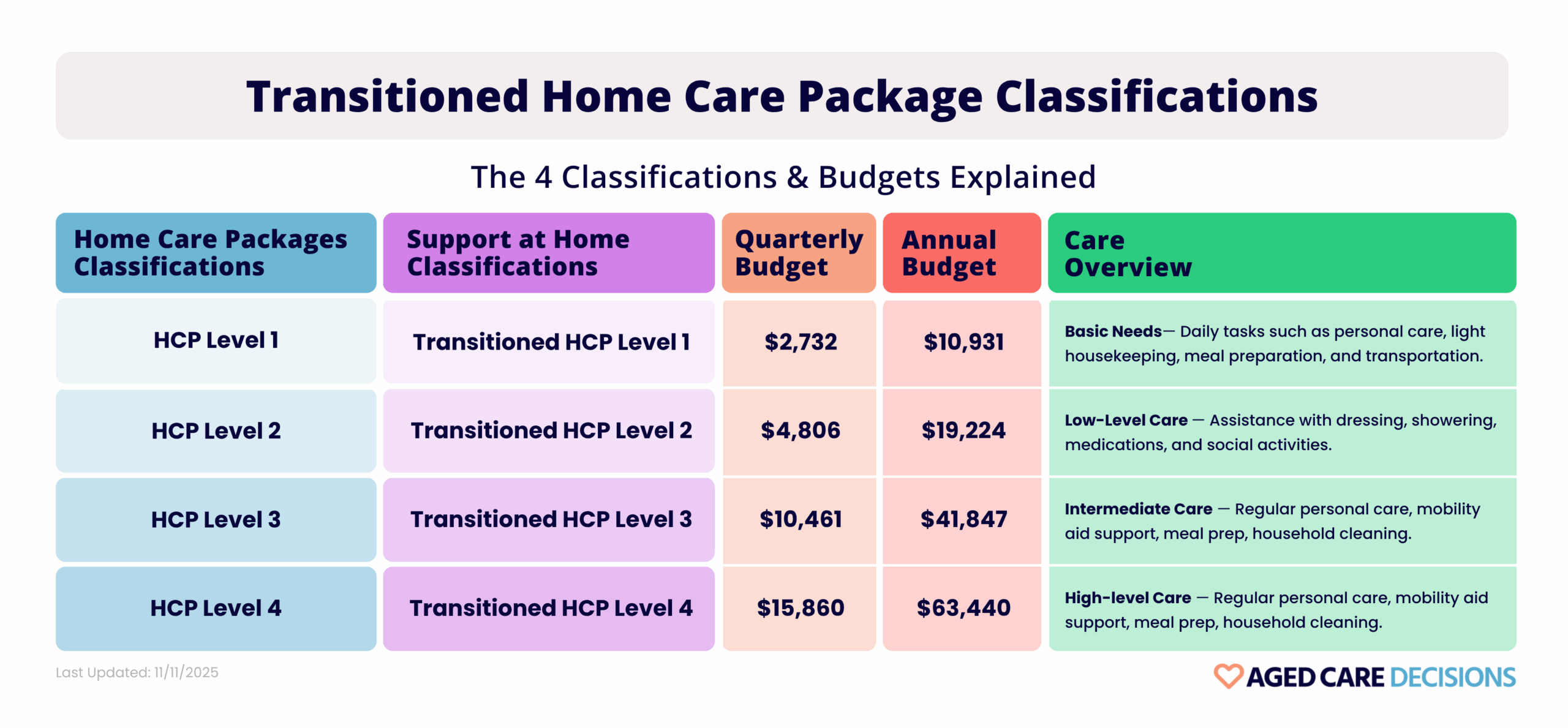 Existing Home Care Package (HCP) participants before 1 November 2025 will maintain their current funding when they move to the Support at Home program. Each person will be assigned a corresponding Transitioned HCP Level 1, 2, 3 or 4, with the same annual funding provided on a quarterly basis. From 1 November 2025, new participants in Support at Home will be assessed under the new eight classifications.